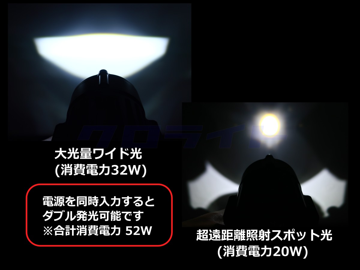 消費電力:スポット光(20W)、ワイド光(32W)、同時発光(52W)